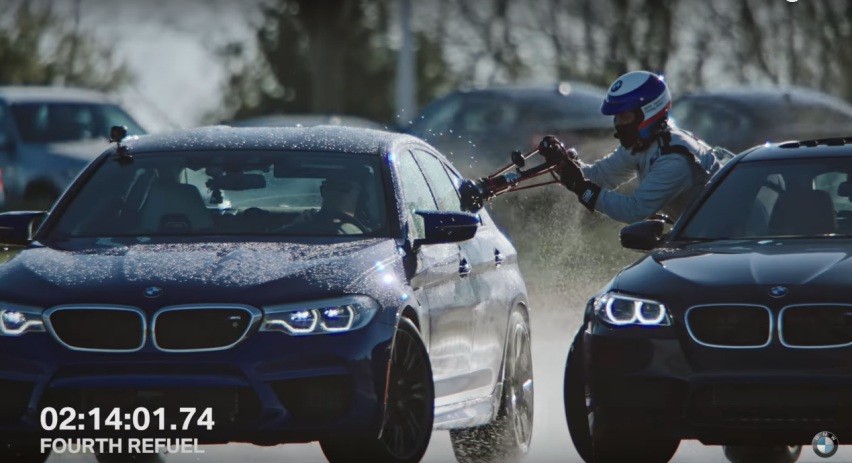 Karena selama 8 jam mesin M5 terus bekerja pada putaran tinggi, jelas bensinnya pasti habis. Agar tidak perlu berhenti, tercetus mengisi bahan bakar sembari berjalan. Yang berarti mobil tandemannya harus juga drifting, bukan berjalan seperti biasa.