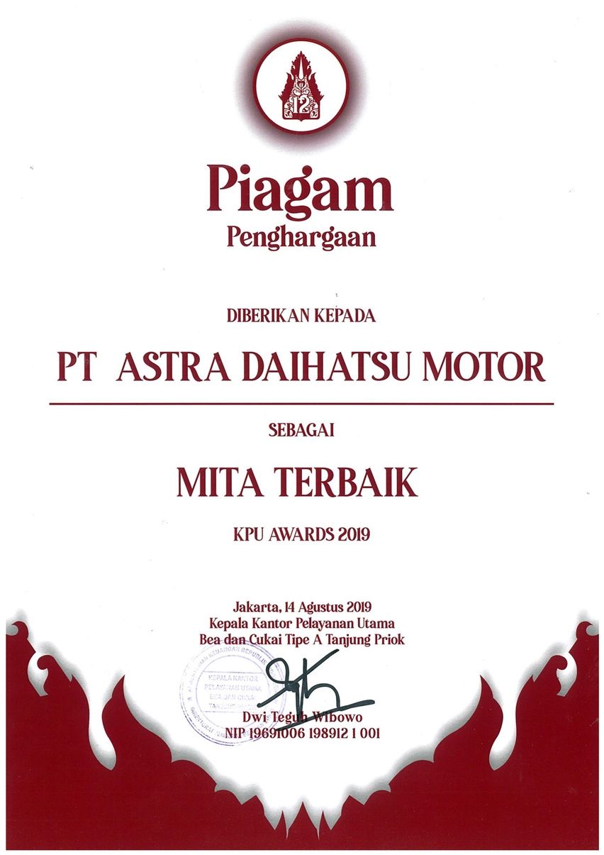 Penghargaan ini menjadi kali kedua bagi Daihatsu setelah sebelumnya diraih pada 2017. Melalui ajang ini, Daihatsu dinobatkan kembali sebagai perusahaan yang mendukung pemerintah. Khusus dalam hal kebijakan ekspor-impor melalui beberapa kriteria yang ditetapkan KPU Bea dan Cukai Tipe A Tanjung Priok. Selain itu, melalui kegiatan ini, Daihatsu ikut berkontribusi terhadap penerimaan negara sebagai perusahaan yang patuh dan taat pajak.