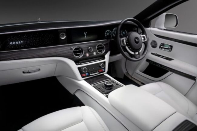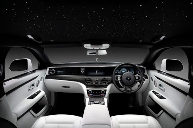 Starlight Headliner menjadi sajian utama kabin Ghost. Gugusan bintang divisualisasikan lewat rangkaian 152 LED di bagian atap berwarna hitam, yang memukau saat gelap atau malam hari. Sistem hiburan dilengkapi oleh audio yang terpusat pada layar sentuh infotainment di tengah kabin.