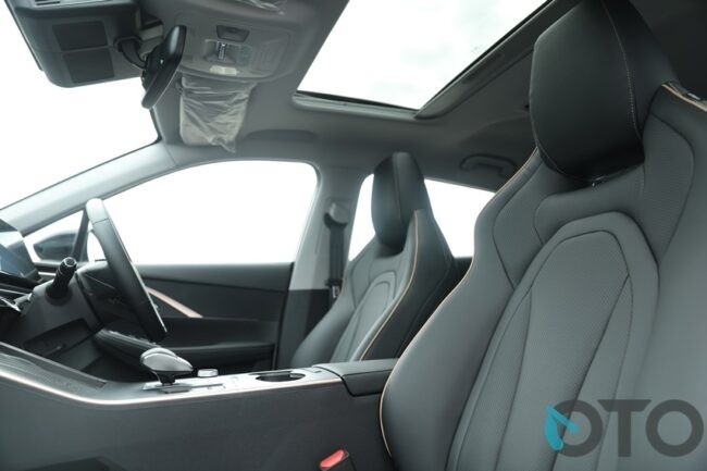 Desain kabin tak kalah modern. Tampil sporty tapi minimalis dan bersih. Bagian dasbor tak banyak embel-embel. Selain layar yang menyatu antara instrument cluster dan head unit. Masing-masing punya ukuran lebar, 10,25 inci. Head unit bisa terhubung melalui kabel dengan Apple CarPlay dan Android Auto. Selain itu, juga berfungsi sebagai pengatur beberapa fitur, termasuk ADAS dan ambient lighting. Pengaturan AC pun bisa diakses dari layar head unit. Sedangkan tombol utama pengaturan AC, menggunakan panel sentuh. Tersedia pengaturan 2 zona untuk penyejuk kabin. Yang artinya bisa berbeda suhu untuk penumpang dan pengemudi.