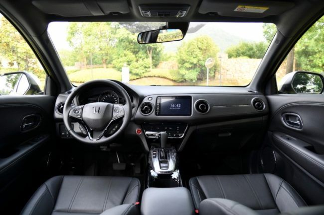 Saat Anda memasuki kabin, semua interior berbalut hitam. Mulai dari dasbor, lingkar kemudi, doortrim hingga jok kulit serba berwarna gelap. Nyaris tak ada beda dengan HR-V. Lubang AC berbentuk bulat dan head unit pakai model non-floating monitor. Meski tak disebut ukuran layar, namun kemampuannya cukup lengkap. Ia sanggup menampilkan navigasi gps, multi-audio player hingga koneksi smartphone.