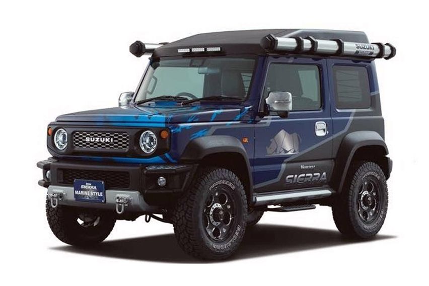 Model kedua Jimny Sierra dengan tema Marine Style alias mancing mania. Tentu gaya off-roader dipertontonkan dengan ban bertapak pacul dan pelek berpalang tebal. Bumper depan makin tangguh dengan dua tambatan untuk kerekan. Ada pelat yang berfungsi menjadi pijakan juga. Menariknya, di atap dipasangkan tempat penyimpanan berbentuk bulat, yang berfungsi untuk meletakkan alat pancing. Tubuh dicat kombinasi, biru dan hitam yang motifnya menguatkan karakter tangguh. Sementara di dalamnya, disematkan material antiair yang sama dengan bahan baju selam. Jimny Sierra Marine Style bakal mejeng bersama kapal kecil Suzuki S17 untuk menyempurnakan konsep yang diusung.