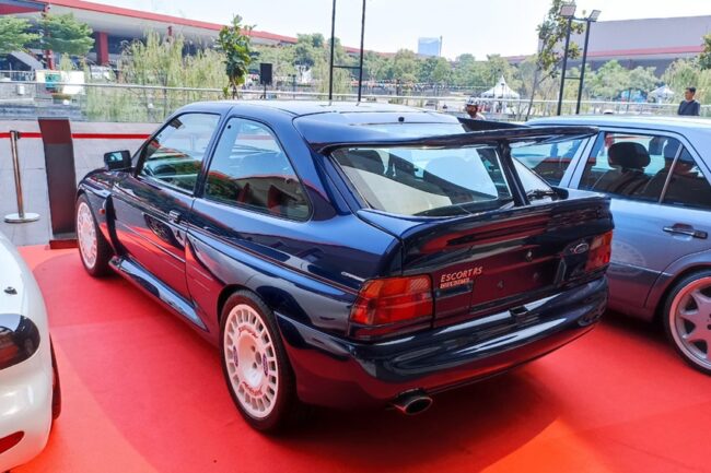 Ford Escort Cosworth RSIa merupakan hatchback langka dengan format dua pintu lansiran Ford. Volume ruang bakar 2,0 liter. Tak sedikit pengunjung yang terpana melihatnya. Sebab, belum tentu Anda menjumpai saat di jalanan. Barang yang satu ini ialah hasil dari restorasi. Tapi bukan sembarangan disulap seolah jadi barang baru. Ford Escort Cosworth RS lansiran 1996 dibikin kembali seperti spesifikasi pabrikan. Tampilan dibuat rally look dengan pelek OZ 18 inci plus ban Michelin Pilot Sport 4s. Jangan tanya berapa angka jualnya. Sangat gelap di pasaran. Ini sekadar tebakan saja. Mungkin tembus miliaran rupiah.