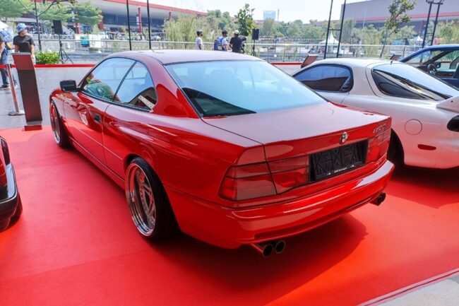 BMW 850 ciKalau Anda melihat produk Alpina, mungkin sudah biasa, walau tergolong jarang unitnya. Nah, sedan klasik BMW 850ci pun tak terlewat dari pandangan pengunjung. Bentuknya unik, mengingatkan kita pada BMW M1. Sang sedan berkelir merah, terlihat sangat rapi. Di balik pahatan tubuh lurus, bersemayam mesin 5.000 cc plus transmisi matik. Sisanya menggunakan Racing Dynamics steering wheel, front spoiler dan pelek 19 inci.