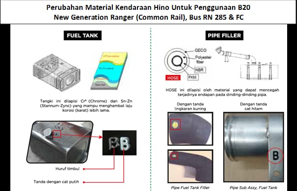 Produk Hino, yang pakai teknologi common-rail sudah dilengkapi spesifikasi komponen khusus, untuk mengkonsumsi bahan bakar B20. Seperti pada bagian fuel tank, dilapisi krom dan stannum-zync. Zat ini dikatakan mampu menghambat laju korosi. Selain itu, pipa filler juga turut dilapisi material yang dapat mencegah terjadinya endapan.