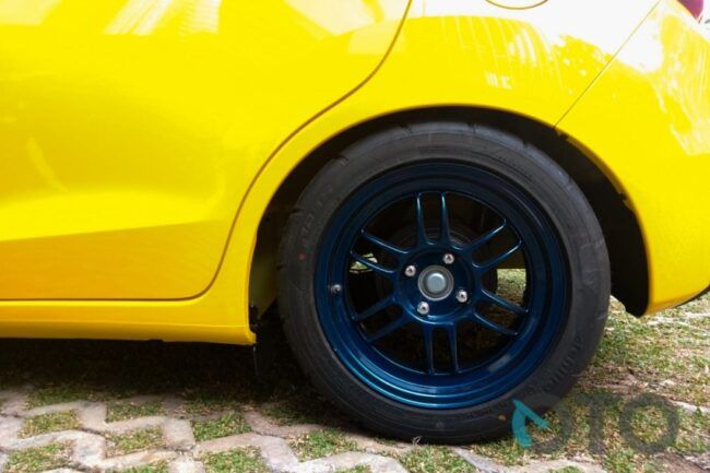 Pelek itu pun tak dibiarkan standar. Kelir biru dilabur pada seluruh permukaan, berpadu dengan bodi kuning nan cerah. Setiap orang pasti sadar, tema warnanya berlaga ala Spoon, tuner asal Jepang yang lekat dengan brand Honda. Lantas ban sport, Achilles 123S membalut sepatu baru itu, dengan profil 195/50 R15 di keempat roda. Grip dari seri ini dinilai cukup baik untuk permukaan aspal sirkuit. Selain itu, untuk penggunaan harian atau kala hujan, pattern masih sanggup membuang air dengan baik. Kendati pasti tak semaksimal ban tipe lain, karena ini semi slick.