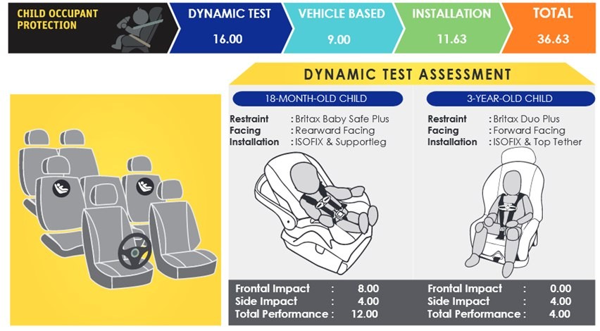 Variabel kedua, COP, yang mencakup 25% dari nilai total, Xpander meraih 18,69. Pada tes ini, dua simulator anak diletakkan dalam child car seat. Ukuran dan sensor simulator disesuaikan dengan ragam kondisi. Ada anak umur 18 bulan dan 3 tahun. Untuk anak pertama diletakkan menghadap belakang, dan anak yang lebih besar menghadap depan. Hasil total menunjukkan, pemasangan child seat pada Xpander bisa dilakukan dengan sangat baik dan memungkinkan penjagaan yang maksimal pada anak.