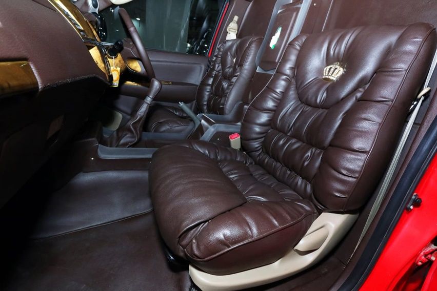 Uniknya, Byung lebih memfokuskan ubahan pada baris kedua. Sofa berbusa padat dengan motif kerut dipasangkan, kemudian dibalut Camaro Dark Brown. Pelapis itu juga merambah area doortrim, pilar, atap dan kotak audio. Meski memakai satu warna, tapi ia berhasil mewujudkan tampilan yang apik dipandang.