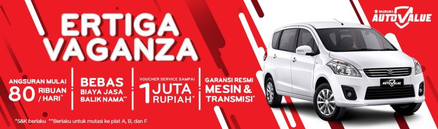Melalui program Ertiga Vaganza, Suzuki Auto Value di wilayah Jabodetabek memberikan kembali layanan gratis biaya jasa balik nama. Menariknya lagi, terdapat hadiah tambahan berupa kupon servis gratis, yang bernilai hingga Rp 1 juta. Penawaran ini berlaku hingga akhir November 2018 dan bisa didapatkan dengan paket angsuran ekstra hemat mulai dari Rp 80.000-an saban hari.