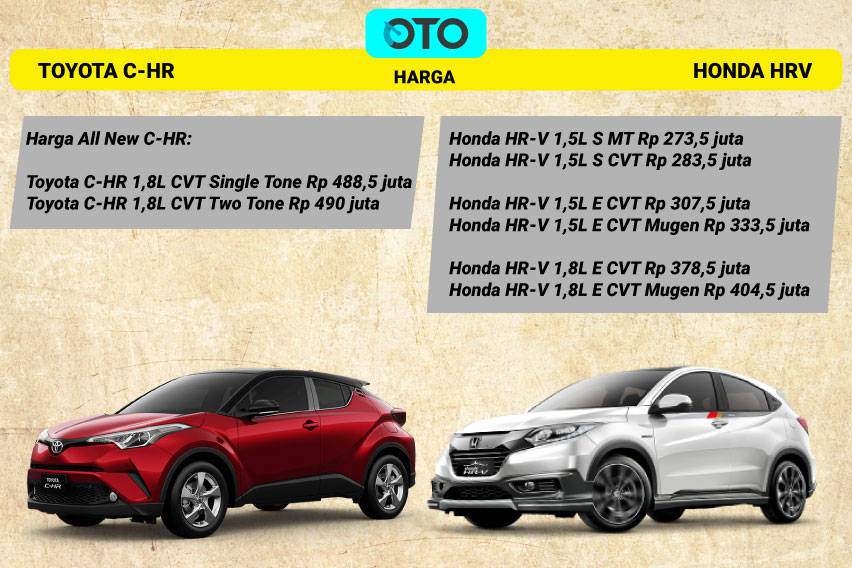 Toyota C-HR dijual di Indonesia dalam satu pilihan saja. Uniknya mobil ini ditawarkan alternatif warna two-tone dengan atap bernuansa hitam. Varian single tone color dijual Rp 488,5 juta dan Rp 490 juta untuk yang beratap warna hitam. Sementara itu, HR-V dijual dalam banyak varian. Ada yang bermesin 1,5 liter dan 1,8 liter. Ada yang bertransmisi manual, ada pula yang otomatis CVT (Continuous Variable Transmission). HR-V bahkan punya tiga tipe yang bisa dipilih, mulai dari tipe S, E dan Mugen. Harganya mulai dari Rp 273,5 juta sampai Rp 404,5 juta. Supaya adil, unit yang kami bandingkan HR-V tipe termahalnya, 1,8L E CVT Mugen.