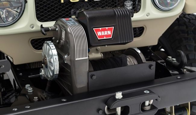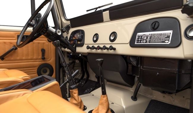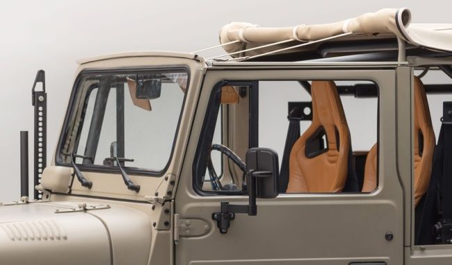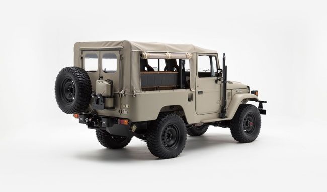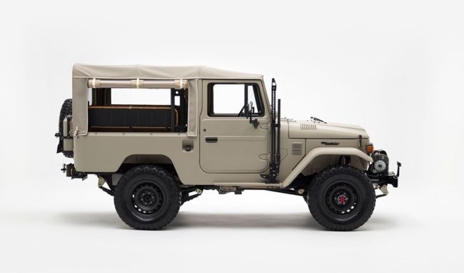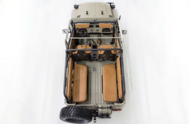Mahal? Iya. Tapi tentu ada alasannya. Toyota FJ dengan balutan cat krem Dune Beige matte itu, hasil restorasi penuh dari FJ 1981 dan diberi sentuhan fitur modern. Chassis dan bodi baja bawaan FJ ditanggalkan seluruhnya dan direnovasi hingga seperti baru kembali. FJ Company kemudian memasangkan aksesori kreasi mereka sendiri seperti pelindung tempat pengisian bahan bakar dan spion yang dilabur cat abu-abu Gunmetal. Bagian bumper depan memakai 40-series yang diskutomisasi dan di atasnya ada winch atau alat derek Warn 8274 yang populer. Satu lagi, FJ Land Cruiser itu juga sudah punya lampu kabut LED yang disuplai oleh Baja Design.