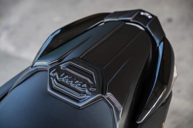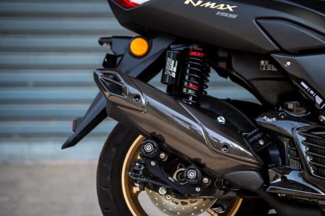 Tak hanya depan, area di sisi kanan dan kiri muka pun turut ketempatan cover. Pun demikian pada bodi di area sekitaran paha, meski tak diikuti oleh tubuh bagian belakang. Buritan Maxi Yamaha ini cuma mendapatkan perangkat berupa cover bernuansa karbon di area radiator, filter udara dan knalpot. Dan, terdapat pula cover penutup jok penumpang. Satu lagi, unit ini tak lagi mengaplikasi suspensi belakang subtank KYB seperti bawaan Yamaha Indonesia. Peredam kejut NMax karya mereka kini sudah menggunakan merek YSS tipe G-Sport.