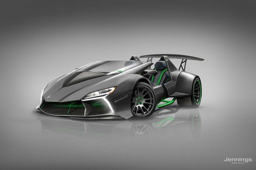 Merek asal Jepang ini memiliki banyak lini motor bermesin besar. Desainnya pun kebanyakan bergaya futuristik dan sporty, contohnya H2. Didasari alasan itu, maka Jennings memilih memvisualisasikan mobil Kawasaki berupa supercar, namun tanpa atap. Sepintas rupanya mirip Lamborghini, dengan kap mesin yang meruncing ke depan.