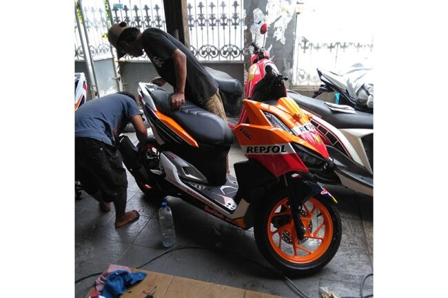 Agar hasil airbrush bisa maksimal, Salim menggunakan bahan cat dan pernis terbaik. Honda Vario 160 berlivery Repsol ini menggunakan material Sikkens.
