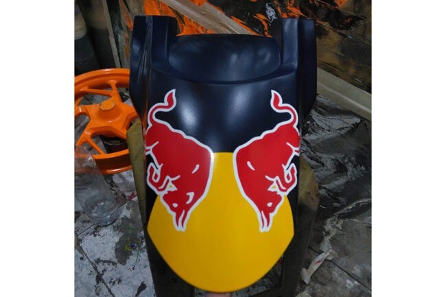 "Revisi desain sampai 3 kali, ganti lagi. Pertama ada logo Redbull, kedua minta polos, terakhir mau ada RedBull lagi. Finishingnya adalah yang kemarin, selesai di akhir Januari," ungkapnya.