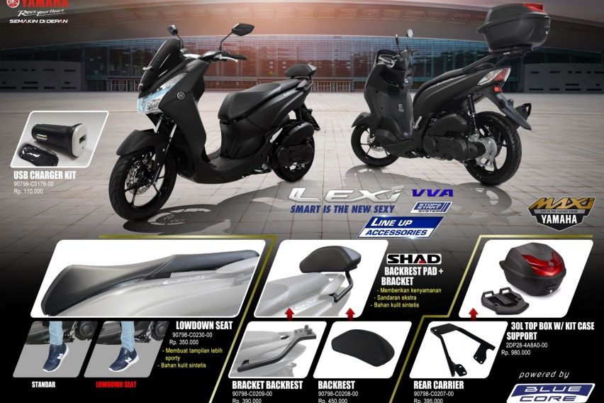 Selain cover suspensi depan, PT Yamaha Indonesia Motor Manufacturing juga menyediakan berbagai aksesori lain untuk skutik dari keluarga Maxi itu. Berikut daftar dan harga aksesori Yamaha Lexi yang dapat dibeli di bengkel resmi Yamaha.