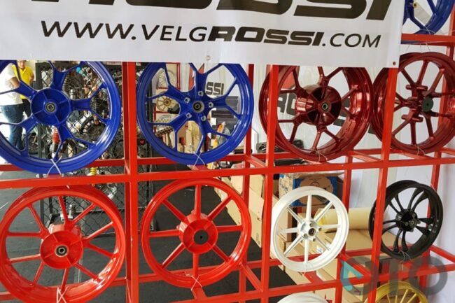 Kalau cari pelek, bisa mampir ke booth Vrossi. Tersedia untuk segala jenis motor. Menyediakan pelek berdimensi 10 inci hingga 17 inci. Ada potogan harga sebesar 20 persen, tentunya selama pameran berlangsung.