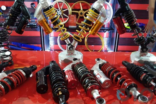 Lagi cari diskon suspensi? Langsung sambangi booth Ohlins, Scarlet. Ohlins beri potongan 5 persen selama pameran berlangsung. Scarlet menawarkan beragam jenis suspensi, dijual mulai dari Rp 1 jutaan hingga Rp 3 jutaan. Ada penawaran diskon 20 persen untuk peredam kejutnya. Selain itu, ada juga part-part aksesori penunjang tampilan. Mulai dari stang, master rem, handle rem, piringan cakram hingga pelek motor.