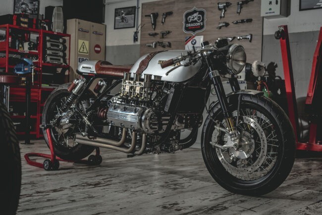 Honda GL1000 Goldwing bukanlah kandidat terbaik untuk dibuat menjadi cafe racer. Ukuran mesin yang besar tentu menjadi tantangan utama bagi para builder. Tapi ditangan D's Motorcycles (sebelumnya dikenal sebagai Dragon's Motorcycles), motor yang punya besar bak ‘kapal induk’ itu bisa diubah secara cermat. Hasilnya pun mampu memukau siapa saja yang melihat.