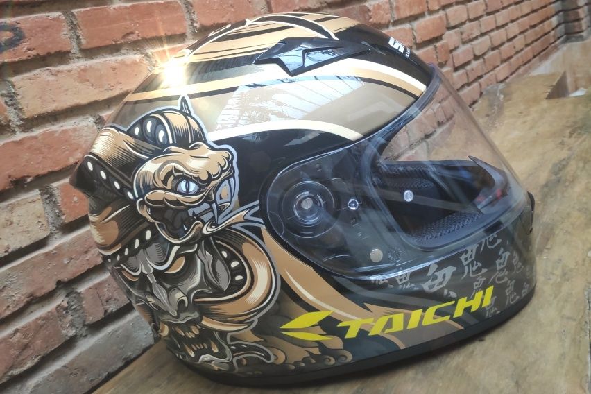 Perihal desain sudah jelas catchy. Karakter topeng setan dengan ular, menghiasi kedua sisi helm. Grafisnya kian mencolok berkat pemilihan kelir emas. Begitu pula pada bagian atas, terdapat tulisan 鬼 (Oni) bak hasil goresan kuas di atas kanvas. Sebagai informasi, kata itu berarti samurai bertopeng setan. Di dalam budaya Jepang, karakter seperti ini kerap digunakan untuk menakuti lawan. Sebagai pelengkap, logo Taichi menghiasi bagian pipi helm.