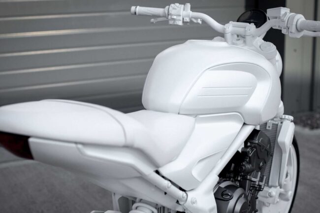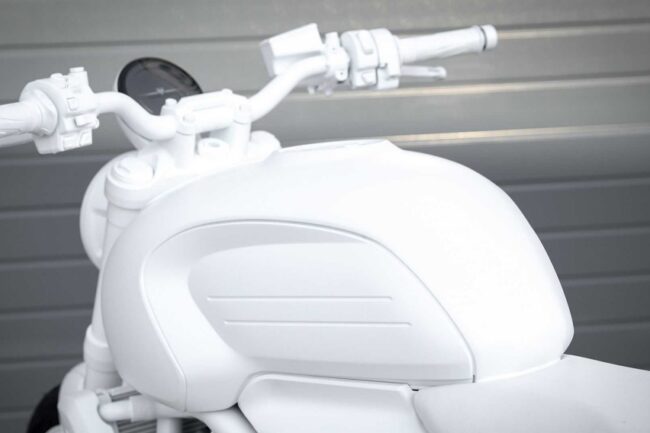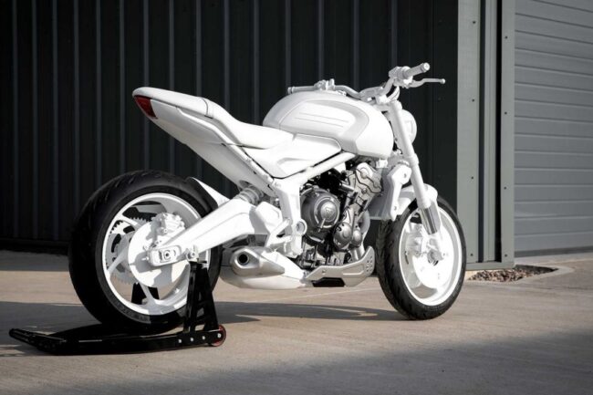 Triumph Trident yang diklaim sebagai 'prototype' ini seperti sebuah motor layak jalan yang disepuh kelir putih doff. Bagaimana tidak, mesin dengan blok sepantasnya saja ada di situ. Tak mungkin ia ditopang oleh material non metal.