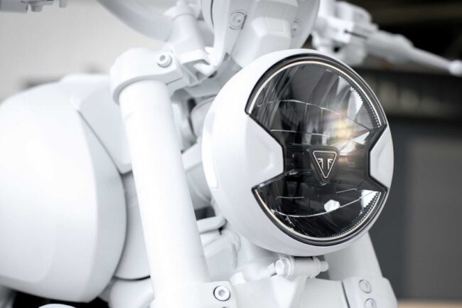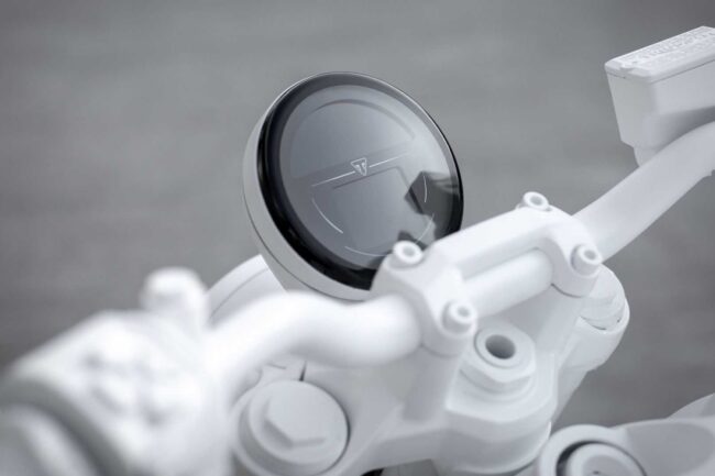 Prototype Triumph Trident pun dirilis sebagai sebuah pajangan di museum desain London, kemarin (25/8). Ketimbang menyebutnya sebuah prototip yang masih akan melalui proses implementasi ke versi produksi, Trident ini lebih layak disebut motor jalanan yang sedang berkamuflase. Warna putihnya memang bisa diartikan sebagai material plastik atau lain yang jadi penyusun karya seni kontemporer. Namun kami kurang percaya.