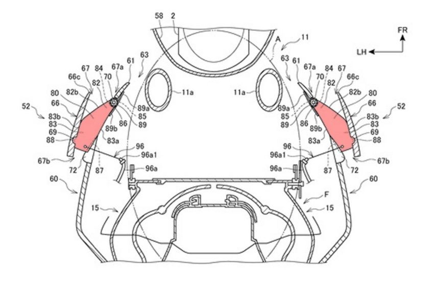 Gambar paten pertama, sudah pernah terungkap sebelumnya. Terihat di daerah fairing, komponen yang diberi warna merah (nomer 80) belum aktif. Artinya, ECU mendeteksi belum diperlukan gaya tekan ke bawah. Angin lewat begitu saja di sisi samping ruang winglet. Saat motor terdeteksi membutuhkan tekanan ke bawah, ECU langsung ‘menyuruh’ penggerak mekanis wing mengulur kabel. Wing keluar dan aliran angin yang melewati ruang winglet menghasilkan daya tekan ke bawah.