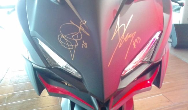 Tanda tangan ditulis menggunakan spidol emas, tepatnya di bagian paras motor yang berbalut warna mat gunpowder black metallic. Menariknya, masing-masing CBR250RR mendapatkan dua tanda tangan sekaligus. Menjadikan kuda besi tersebut begitu eksklusif, sehingga cocok sebagai barang koleksi.