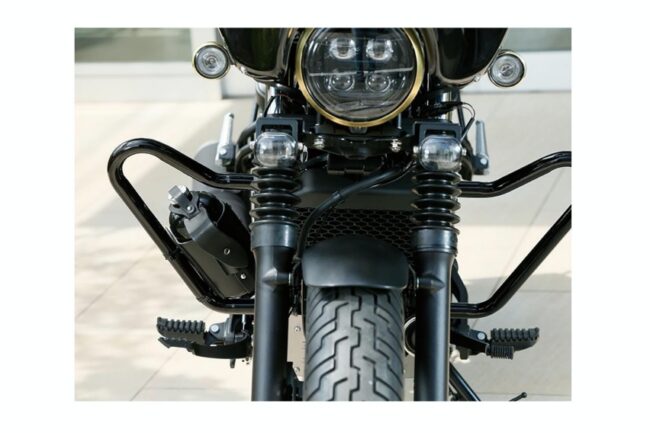 Ya, kesan Rebel yang notabene cruiser perkotaan pun sedikit bergeser. Seperti pada Harley, item itu mendukung untuk pengendaraan jarak jauh alias touring. Bahkan tepat di bawah headlamp, terpasang lampu kabut jenis LED. Tak berhenti di situ, tampilan muka Rebel dibuat lebih ciamik dengan sematan trim berwarna emas pada cover lampu utama juga sein.
