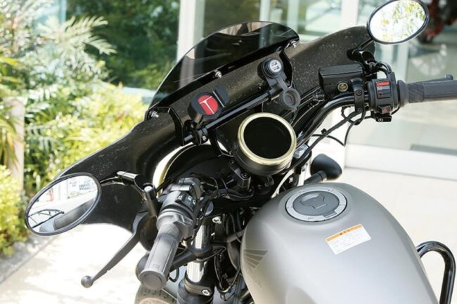Penggunaan unsur serupa kembali terlihat pada area panel meter. Honda Rebel modifikasi ini Tapi jangan berharap ada fitur infotainment selengkap kepunyaan motor touring Harley-Davidson. Pasalnya, layar bulat pada Rebel itu hanya menyajikan informasi (digital) fundamental saja. Jika ingin mendapatkan sensasi layaknya H-D, satu-satunya solusi ialah menggunakan smartphone. Oleh karena itu, Kijima menyediakan phone holder beserta USB port. Paling tidak bisa dimanfaatkan untuk memandu perjalanan, sekaligus mengisi ulang daya gawai.