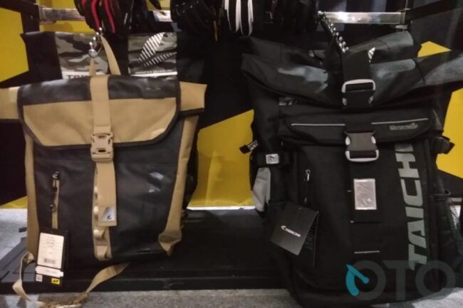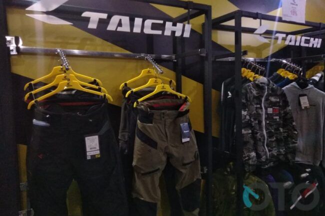 Masih di booth yang sama, mereka juga menjual produk Taichi. Jenisnya lebih beragam lagi. Seperti tas waterproof berbagai ukuran, dijual Rp 500 ribu – Rp 2,3 jutaan. Sepatu kulit setinggi mata kaki dengan bahan dan grip khusus, Rp 3 jutaan. Sementara jaket, dengan atau tanpa protektor, seharga Rp 900 ribu – Rp 4,2 jutaan. Masing-masing diberi potongan 10 sampai 15 persen.