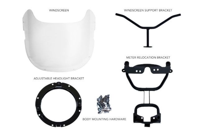 Komponen yang masuk ke dalam paket, antara lain : windscreen, meter relocation bracket, bracket lampu depan yang dapat diatur, bracket pendukung windscreen, cowl depan, fairing kiri dan kanan, cowl bawah, cover tangka bahan bakar, cowl buntut dan perangkat body mounting.