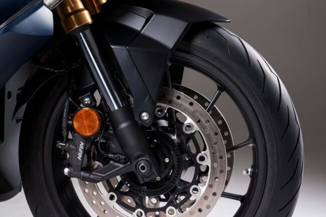 Kedua unit suspensi menawarkan travel 120 mm, dirasa cukup memadai saat dipakai ke luar kota. Untuk penghenti laju, dirinya mengandalkan cakram depan ganda berdiameter 310 mm yang dijepit kaliper empat piston dari Nissin dan terpasang secara radial. Rodanya model ‘belang’, depan pakai 17 inci dan belakang 15 inci. Tak lupa ABS dual-channel yang menjadi piranti standar.