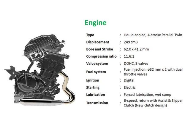 Suksesnya penjualan Ninja seperempat liter ini, tak bisa dipungkiri berasal dari berbagai kelebihan yang digendongnya. Jantung mekanis gres berkapasitas 249 cc sanggup mengeluarkan performa terbaik dibanding rival. Torsi puncak mencapai 23,5 Nm pada 10.000 rpm dan tenaga maksimal 39 PS pada 12.500 rpm. Sistem transmisi 6-percepatan manual yang sudah dibekali fitur assist & slipper clutch menjadi padanannya.