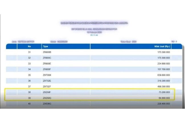 Dalam informasi yang beredar, badan pendapatan daerah pemerintah provinsi Jakarta ada dua model Kawasaki ZX-25R 4 silinder yang dibanderol dengan harga off the road mencapai Rp 64,8 – Rp 73,2 juta. Sedangkan harga on the roadnya dibanderol Rp 74,3 juta hingga Rp 83,9 juta. Benarkah? Sabar, hanya tinggal kurang dua minggu lagi. (Hrf/Hlm)