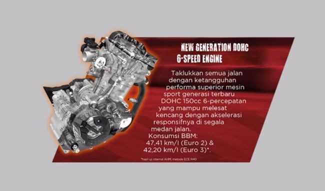 Jantung mekanisnya berkonfigurasi 1-silinder DOHC dengan kapasitas 150 cc. Mesin ini mampu menghasilkan torsi puncak 14,2 Nm pada 6.500 rpm dan tenaga maksimal 16,3 PS pada 9.000 rpm.