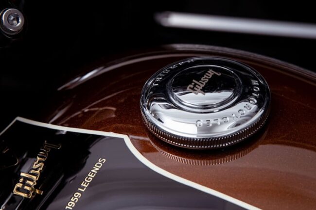 Sepeda motor bergaya klasik ini memakai tangki bensin berkelir sunburst sama dengan warna bodi gitar elektrik klasik Gibson Les Paul. Supaya lebih jelas kesan musiknya, ada aksen berbentu leher gitar di tangki bensinnya itu lengkap dengan logo Gibson dan tulisan 1959 Legends.