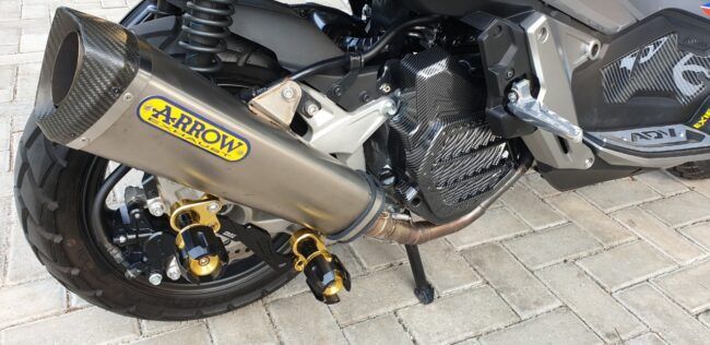 Meski begitu, knalpot berlabel Arrow Thropy tak serta merta dapat terpasang. Kudu ada custom, lantaran muffler itu bukan peruntukannya. "Knalpot buat CBR1000 ini sebelumnya saya pasang di Honda Forza. Tapi, saya mau coba pakai di ADV150. Saat datang ke tukang knalpot langgangan, headernya dimodif dan dibuatkan db killer. Setelah terpasang suaranya jadi bulat dan tenaga juga beda (lebih ngisi)," terangnya lagi.