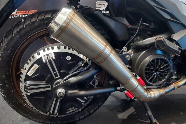 Kemudian kabel dari BLDC diurut sampai ke bawah jok, untuk terhubung dengan controller dan baterai management system (BMS). Karena ada tambahan BLDC di samping velg utama motor, maka secara tampilan dari belakang jadi lebih lebar. Maka dari itu ada penyesuaian bentuk knalpot, yang dibuat lebih pendek dan membengkok ke atas.