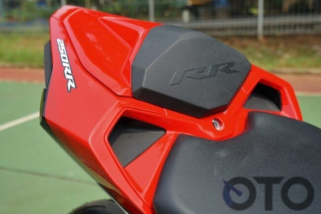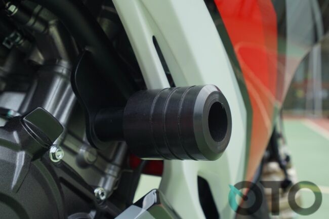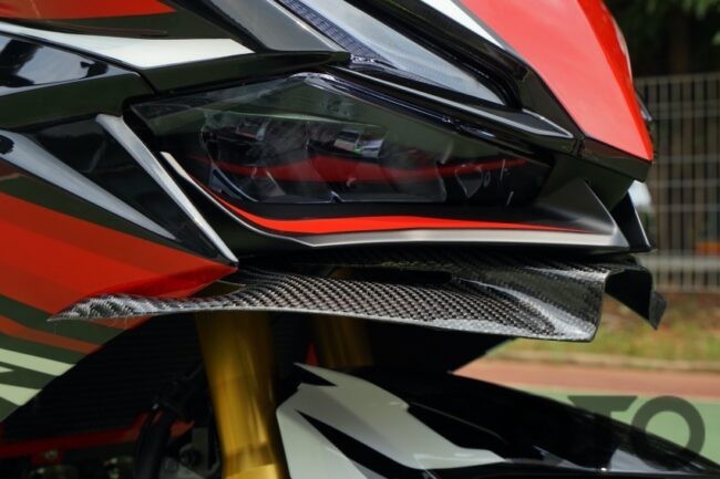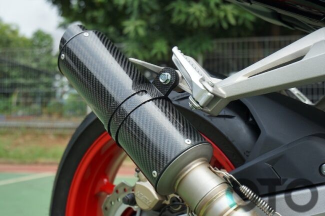 Terlihat jelas pula bahwa penggunaan warna merah begitu mendominasi. Ditambah lagi adanya pewarnaan serupa pada pelek demi mengentalkan nuansa balap. Lantas diikuti pemasangan knalpot custom dengan terapan silincer dan cap (tutup) ala karbon. Selain itu, posisinya pun lebih menjulang ketimbang saluran buang asli CBR250RR SP Quick Shifter.