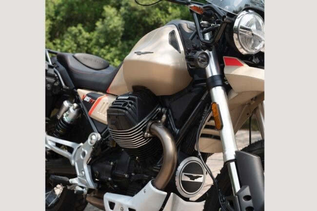 Headlamp bermata ganda dengan teknologi LED dibungkus cover bulat jadi pencahayaan utama. Bagian tengahnya masih diisi DRL yang membentuk elang, ciri khas logo ikonik Moto Guzzi. Sepatbor tinggi lengkap dengan under guard (pelindung mesin) berbahan aluminium di bawah. Hand guard, posisi knalpot diposisikan tinggi indikasi motor ini motor adventure.