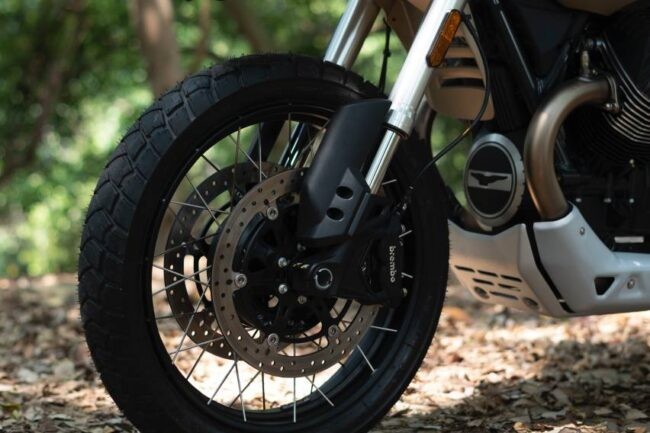 Di varian V85 TT Travel , pabrikan melengkapinya dengan pelek ruji yang lebih ringan 1,5 Kg dari V85TT lama, dan sudah kompatibel dengan ban tubeless. Ukurannya tetap sama, 17 inci di belakang, dan 19 inci di depan. Dirinya juga diberi ban baru yang lebih tangguh ketika dipakai riding. Pakai kulit bundar dari Michelin tipe Anakee Adventure untuk pengendaraan di kondisi ekstrem.