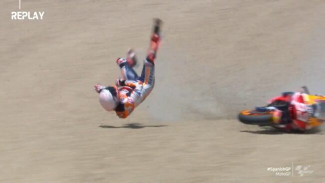 Walau sekarang terlihat sehat, nyatanya Marquez sempat meringis kesakitan usai terjatuh di seri pertama lalu. Bukan hanya menghantam kerasnya aspal setelah high side, saat tersungkur ke gravel pun Marquez ditumbuk oleh motornya sendiri. Khususnya tangan kanan yang mengakibatkan tulang humerusnya patah.