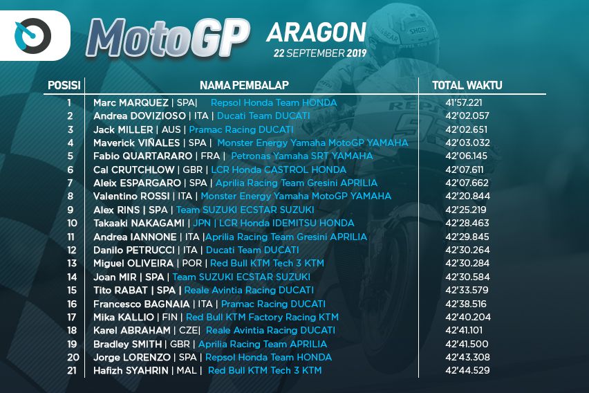 Sementara Marquez sudah lebih dulu melintasi garis finis dengan selisih waktu 4,836 detik. Kemenangan ini membuatnya memimpin klasemen dengan torehan 300 poin. Terpaut 98 poin dari Dovi yang ada di posisi kedua. "Saya yakin dengan strategi kami. Menekan sejak awal, membuat gap 5 detik dan memberikan jarak yang stabil. Sungguh menakjubkan bisa balapan di sini, di depan penggemar," ucap Marquez usai balapan. Kemenangan keduanya usai seri Misano (Italia) juga istimewa, karena kali ini dia melakoni laga ke-200-nya di arena Grand Prix.