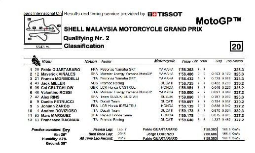 Hampir saja Maverick Vinales (Monster Energy Yamaha) menduduki pole position di kualifikasi MotoGP Malaysia (2/11). Namun, Fabio Quartararo berhasil merebutnya dari sang rider pabrikan. Tak hanya itu, Quartararo juga mencatat rekor baru di Sirkuit Sepang. Sementara itu sial menimpa Marc Marquez. Pembalap Repsol Honda mengalami high side dan terlempar dari barisan depan.