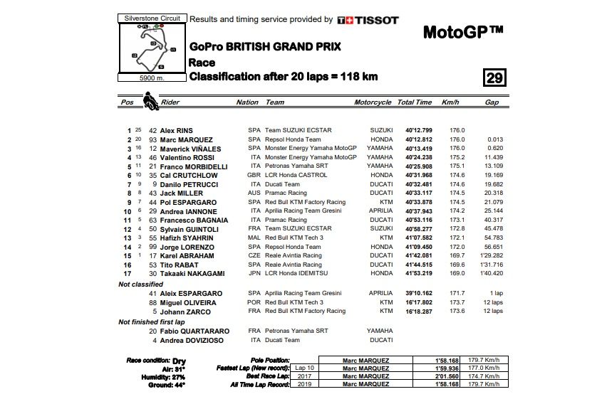 Alex Rins berhasil menjuarai laga MotoGP Inggris (25/8). Pembalap Suzuki Ecstar ini mengalahkan Marc Marquez. Padahal, si pembalap Repsol Honda sudah unggul sejak balapan dimulai. Namun Rins, mampu menaklukkan rivalnya itu di tikungan terakhir. Walhasil, roda Suzuki GSX-RR lah yang menyentuh garis finis lebih dulu.