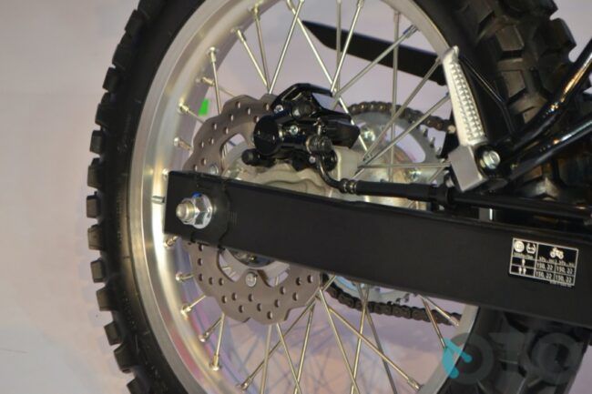 Roda depan berukuran 21 inci dan belakang 18 inci. Keduanya dibalut ban tipe cross berukuran 2,75 depan dan 4,10 belakang. Peleknya jari-jari bahan alumunium. Selain ringan, pelek model ini juga lebih aman digunakan di berbagai kondisi jalan. Sanggup meredam getaran pada mesin, dan lebih fleksibel ketika menghantam lubang. Perawatan juga lebih mudah.