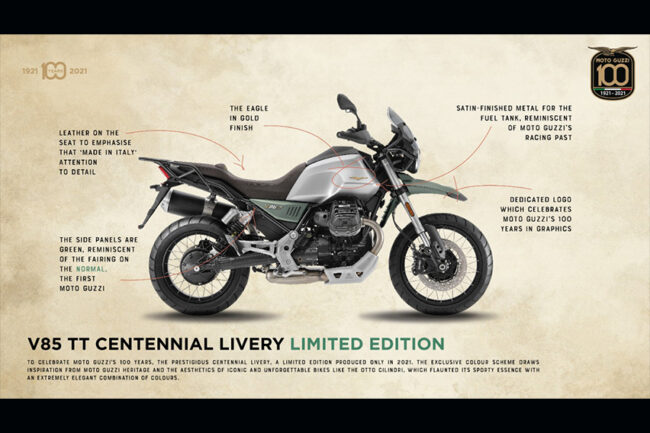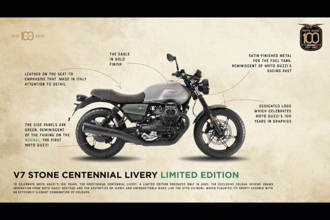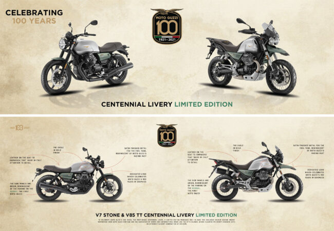 Dan kini mereka menutup 2021 dengan dua model Moto Guzzi 100th Anniversary Limited Edition. Sejak 1921, Moto Guzzi terus berkontribusi dalam inovasi teknik dan desain indah di dunia otomotif dunia. Kombinasi keduanya terlihat pada Moto Guzzi New V7 Stone Centenario dan V85 TT Centenario Limited Edition. Masing-masing diciptakan untuk merayakan pencapaian dan sejarah 100 tahun dari Moto Guzzi.