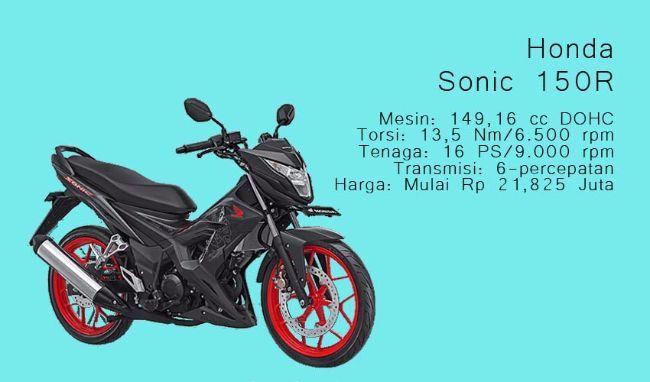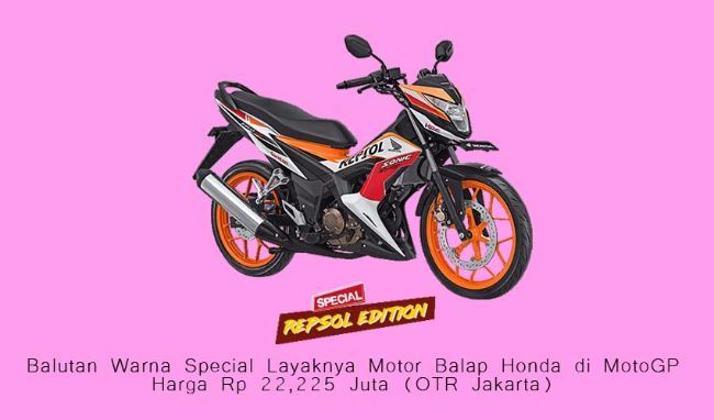 Honda Sonic harganya lebih mahal. Varian standarnya RP 21,825 juta (OTR Jakarta), lalu varian special Rp 22,425 juta (OTR Jakarta) dengan perbedaan balutan warna hitam serta velg merah. Varian tertingginya, Repsol Edition dibanderol Rp 22,225 juta (OTR Jakarta). Pembedanya tentu saja grafis khas tunggangan Marc Marquez di MotoGP. (Lod/Van)