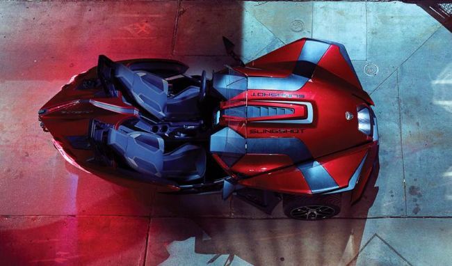 Kehadiran Slingshot menjadi solusi bagi penggemar moge di Amerika Serikat yang menginginkan kendaraan on road yang lebih nyaman untuk dikendarai jarak jauh. Rancang bangunnya memang sepintas mirip mobil sport, namun bagian belakangnya mengerucut dengan satu roda saja. Satu roda belakang itulah yang menyalurkan tenaga dari mesin via sabuk baja menjadi momentum gerak.